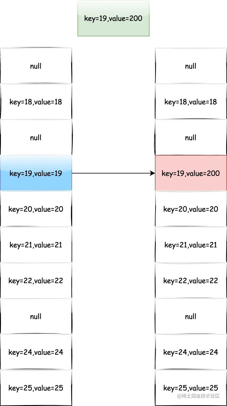//判断当前位置是否有数据,如果key值相同,就替换,如果不同则找空位放数据