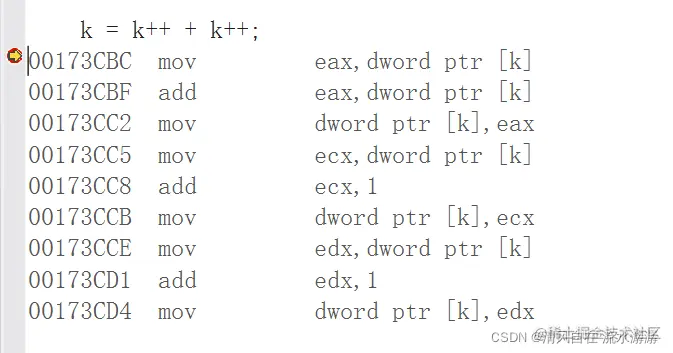 这段汇编代码简单的来说,就是先进行 + 操作,k = 2 + 2 = 4,然后进行两次 ++ 操作,所以最终结果就是 6。