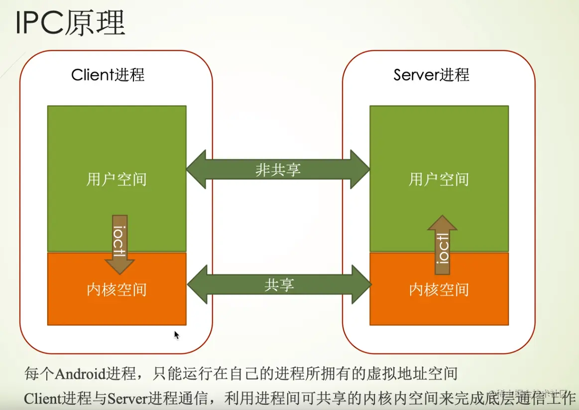 Android进程是运行在系统分配的虚拟地址空间,虚拟地址空间分为用户空间和内核空间。多进程间,用户空间不共享,内核空间共享,进程间通过共享的内核空间通信。