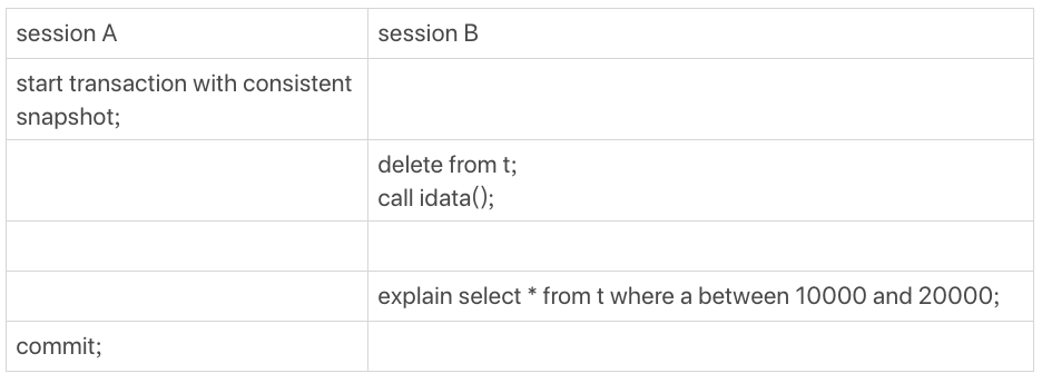 select * from t force index(a) where a between 10000 and 20000;/*Q2*/