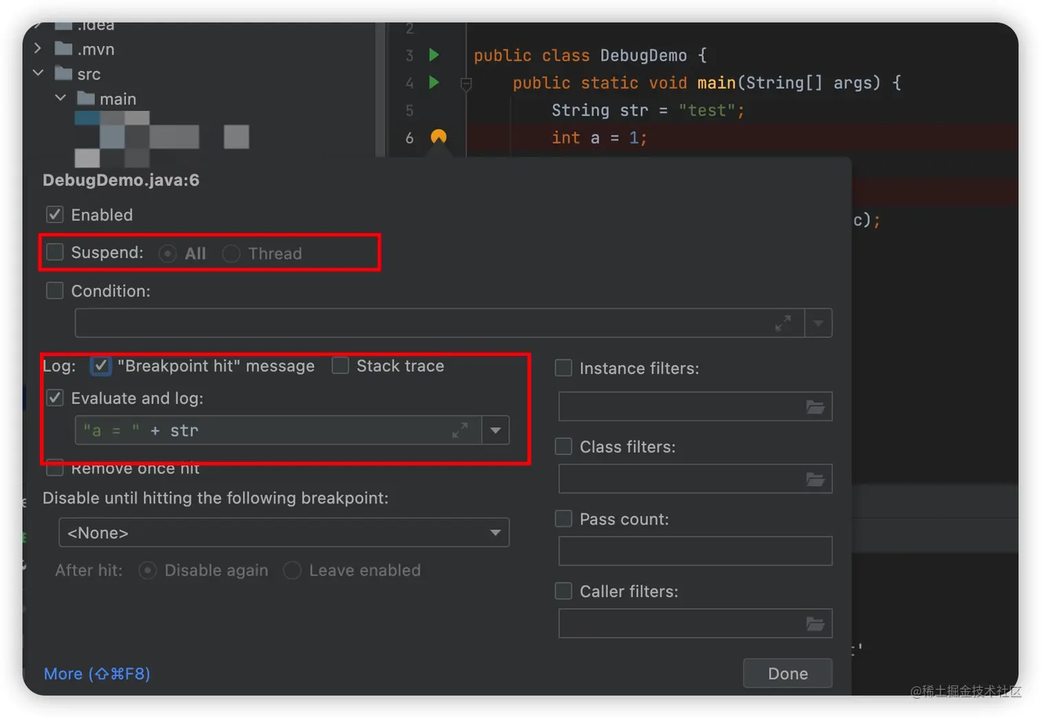 在断点配置里面勾选,命中后打日志,也可以自己加一些其他的输出: