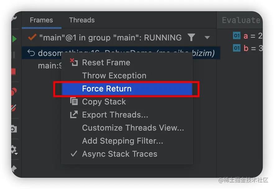 同样在帧的位置,右键,可以提前返回不继续运行,这个提前返回是针对当前的方法的,也可以直接抛出异常;
