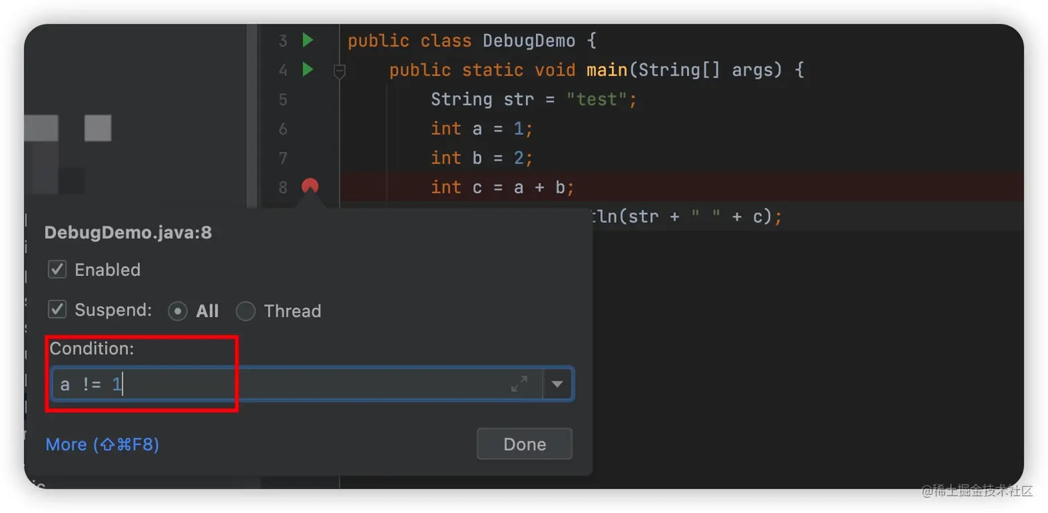 如果说Debug的位置是网关入口,那么流量会很大,各种类型的请求都会走到这个断点里面,如果不能按照条件进入断点,会非常影响我们的效率。