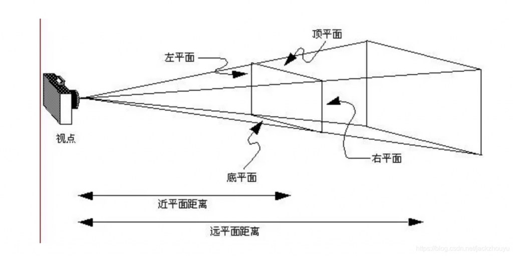 透视投影会产生近大远小的效果,**正投影就是没有 3D 效果的投影方式,用于显示 2D 效果;透视投影就是有 3D 效果的投影方式,用于显示 3D 效果.**产生的视椎体如下图: