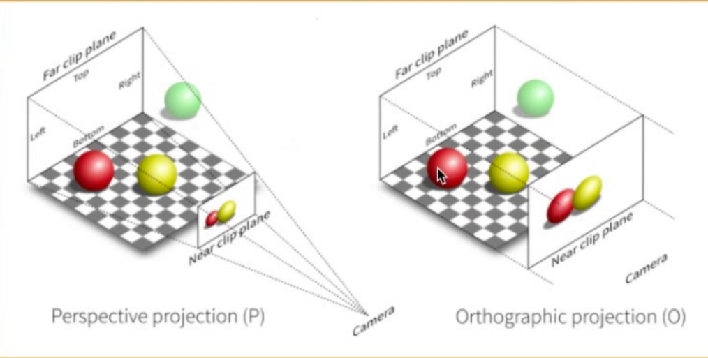 由观察空间到裁剪空间在公式上左乘一个投影矩阵,投影矩阵的产生分为两种:正交投影和透视投影;