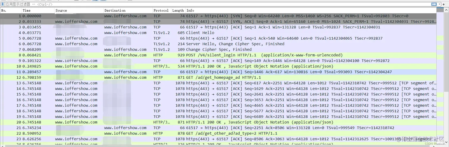最终无奈之下,只能开启流量分析神器 Wireshark 了,直接上图,我已经把关于 OfferShow 的流量包都过滤出来了: