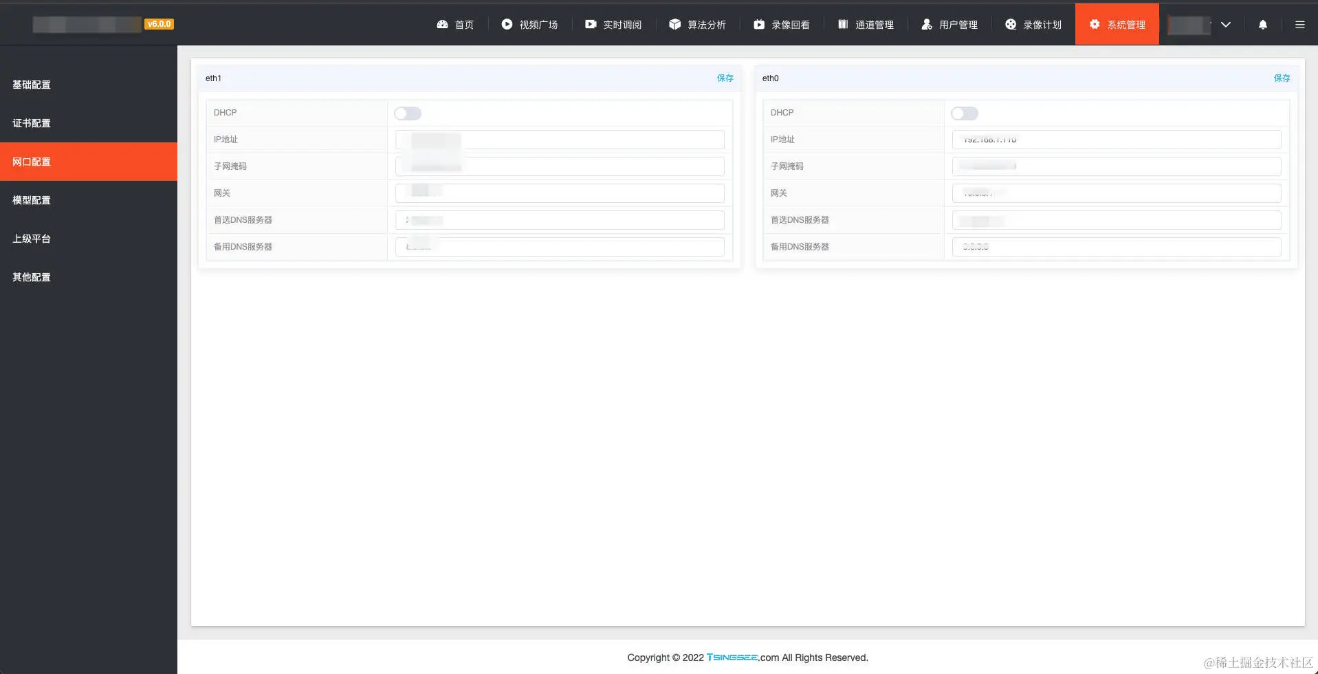 在功能上,我们也在持续开发和完善相关功能,为用户提供更佳的使用体验。近日我们在智能分析网关的后台系统管理模块中,增加了网口配置,主要用于分配智能分析网关的IP地址、子网掩码、网关、首选DNS服务器、备用DNS服务器等相关参数。
