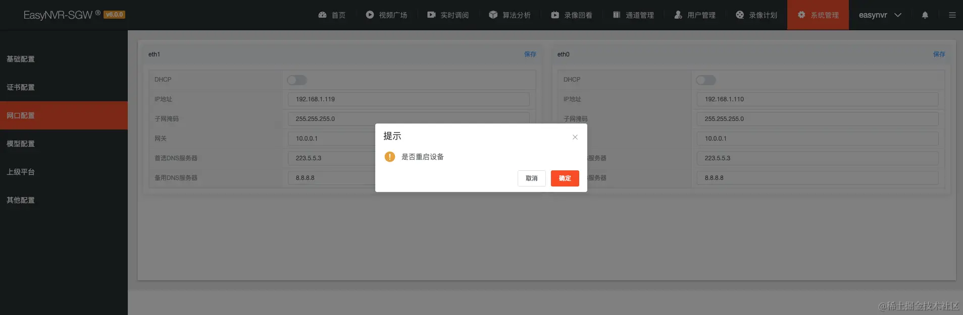 用户可以在此模块中配置网络相关参数,在当前页面编辑后保存,页面将弹出是否重启设备的窗口,如图: