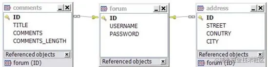 同理 table 属性的值是 Comments 的就会存在于 Comments 表中。那些没有用 @Column 注解改变属性默认的字段将会存在于 Forum 表中。
