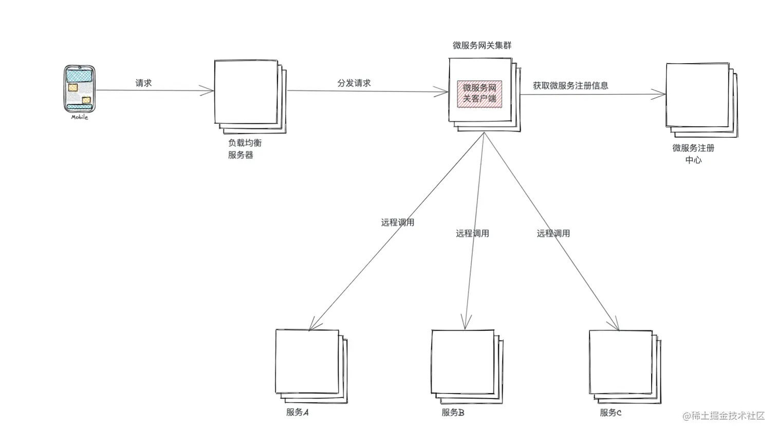 - 具体处理过程是:用户请求通过负载均衡服务器分发给一个微服务网关集群,在网关内开发一个简单的微服务客户端,客户端调用一个或多个微服务完成业务处理,并将处理结果构造成最后的响应结果返回给用户。