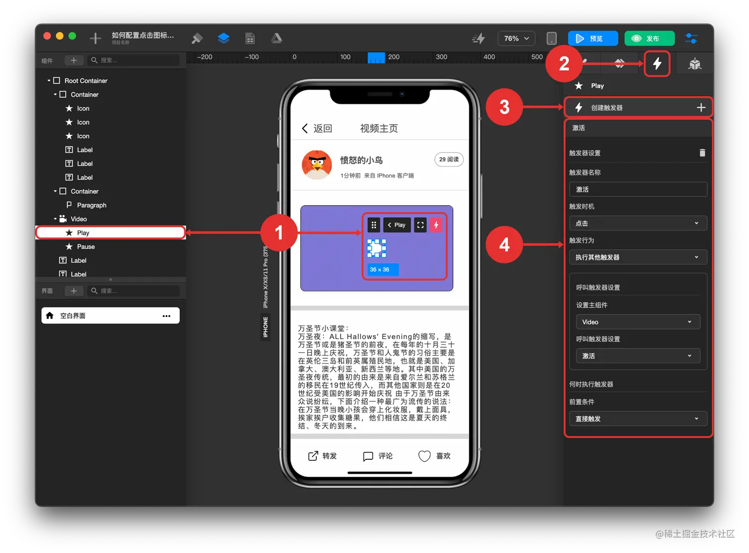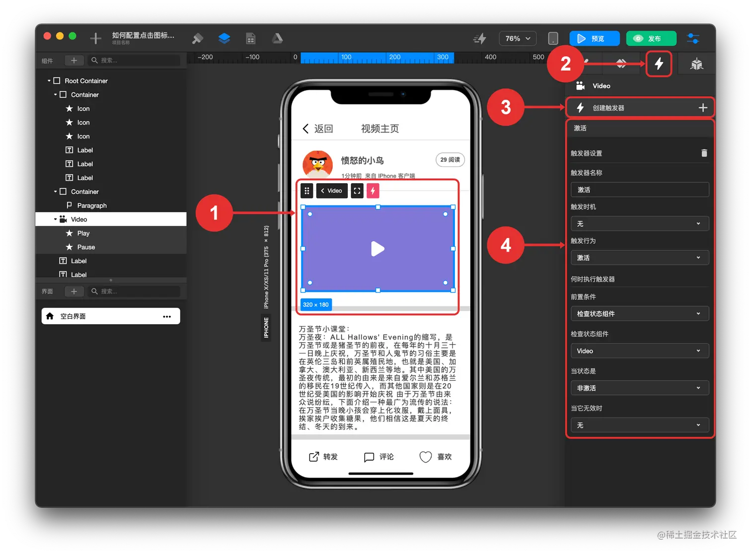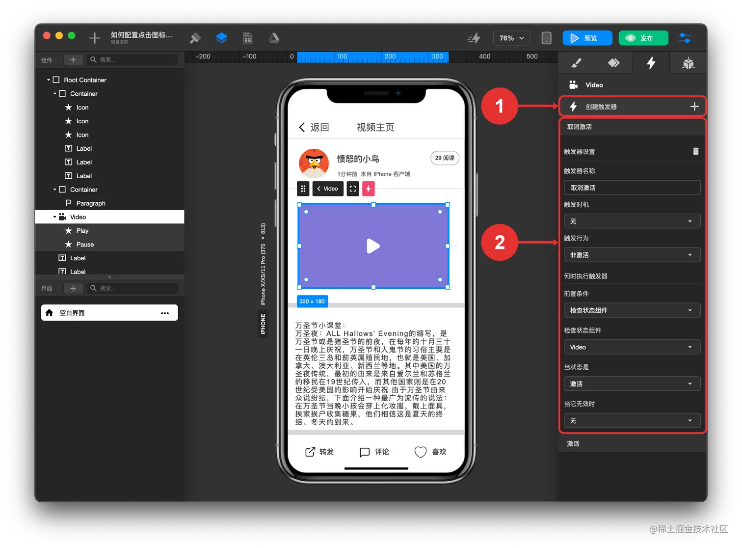 视频组件配置激活触发器