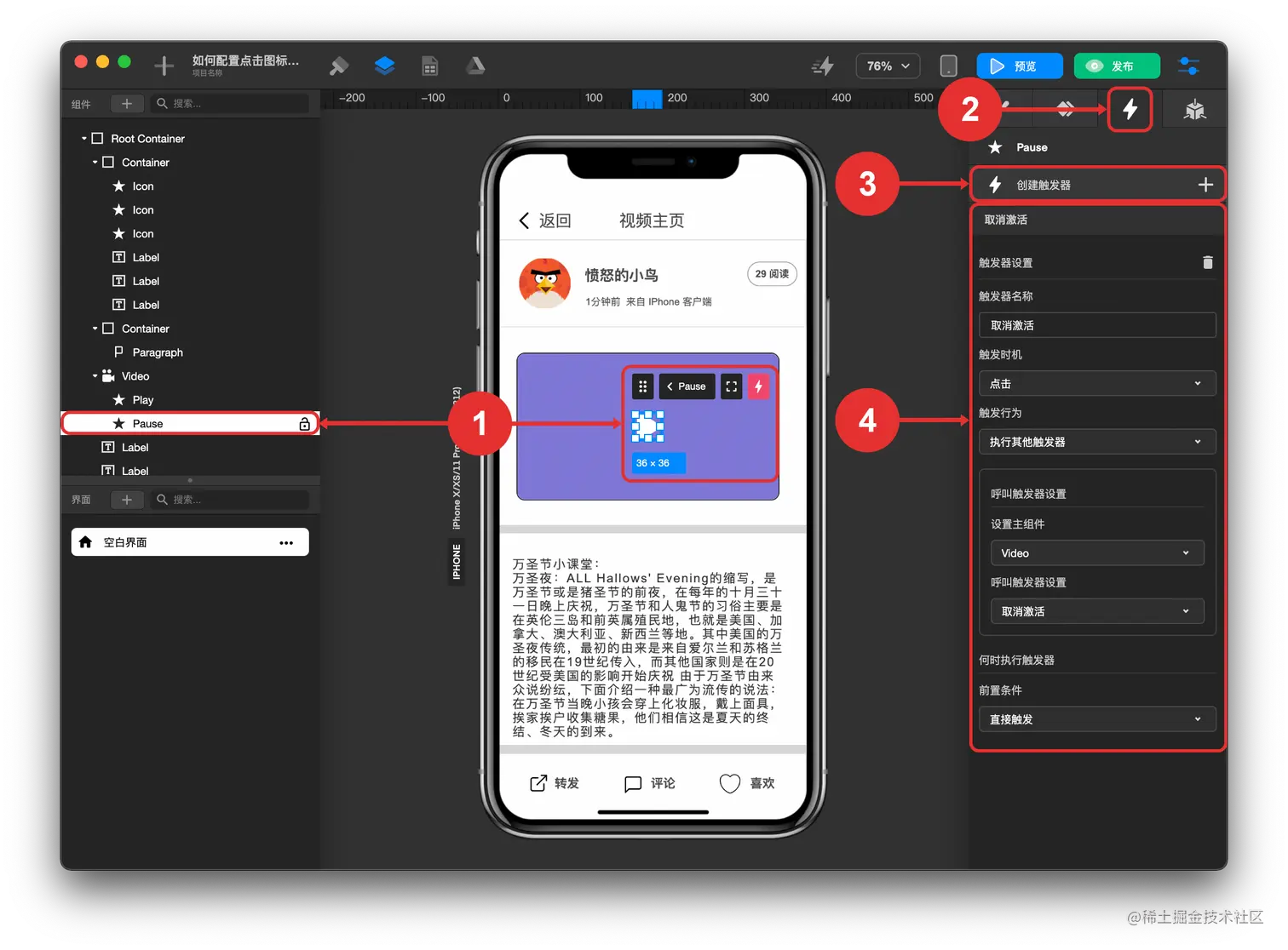 你需要在视频组件上创建 激活/非激活 两种状态 触发器 以对应播放/暂停两种状态,再通过播放/暂停图标上的点击触发器呼叫 激活/非激活 的状态,以实现视频播放暂停的功能。