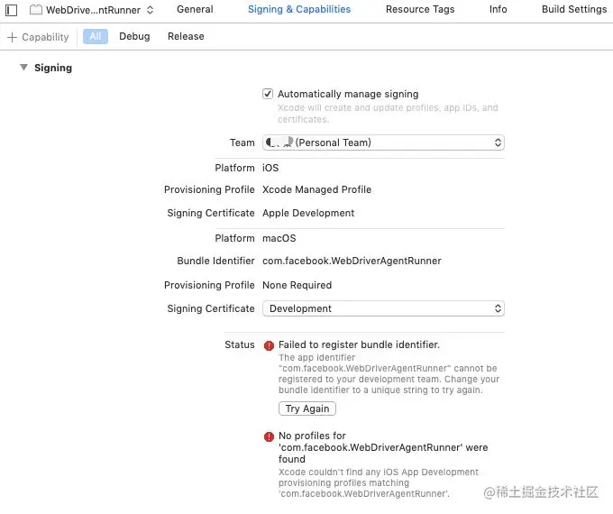 从报错信息来看,缺少 development team,那么我们回到 Xcode,将 Automatically manage signing 进行勾选后选择一个 Team,注意要进入 WebDriverAgentRunner 中进行设置 。