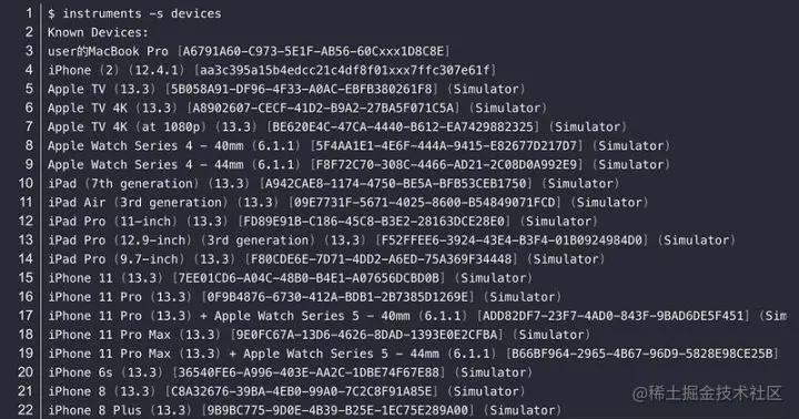 查看模拟器列表:instruments -s devices 运行结果如下,可以看到最前面两行显示的其实是本机的 Mac 和连接的 iPhone 真机,剩下的是模拟器。