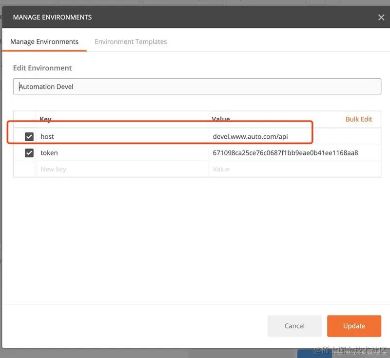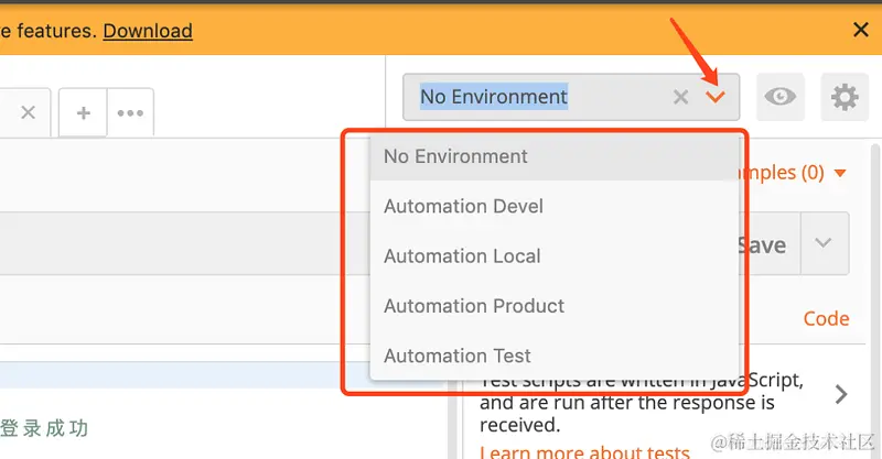 环境“参数集” 中的参数使用方式和全局变量一致,如图中 {{host}} ,不同环境的切换见下图: