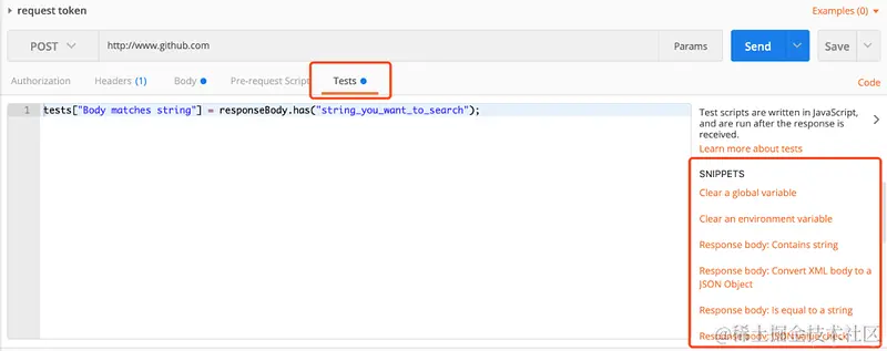 而 Postman 还为我们提供了一些常用的代码模板,在 Tests 面板右边的 SNIPPETS 功能区中,所以对 JavaScript 不大了解问题也不大。代码编写相关将在下文进行具体介绍。