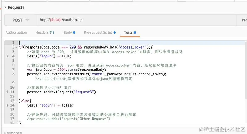 我们在运行完 Request1 接口成功后,不需要再运行 Request2 而是直接跳至 Request3 ,那么我可以在 Request1 接口的 Tests 功能区中执行跳转代码,如: