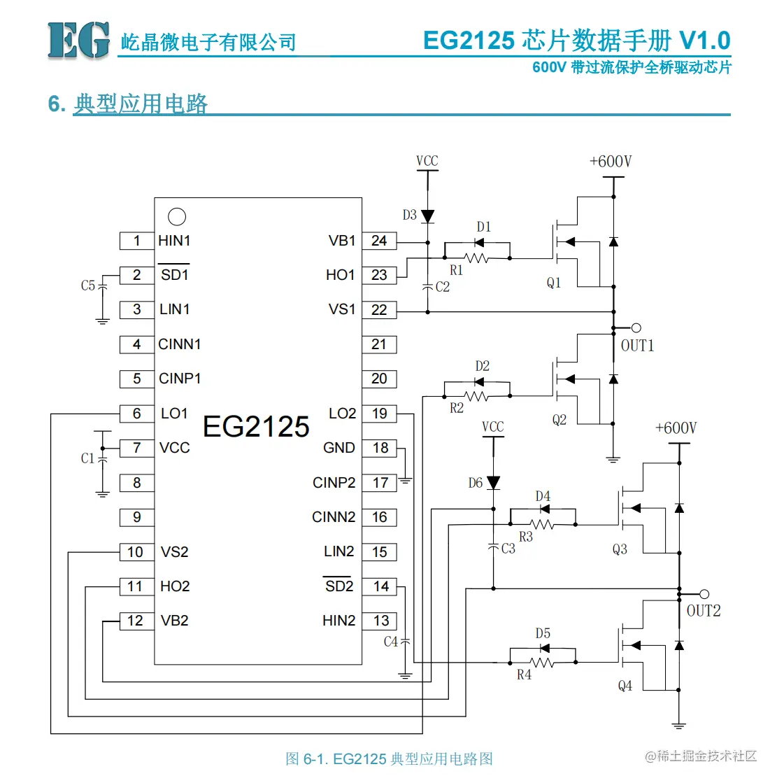 EG2125 的工作电压可达 600V,低端 VCC 的电源电压范围宽 10V~20V,静态功耗低。该芯片 具有闭锁功能防止输出功率管同时导通,输入通道 HIN 和 LIN 内建了 250K 下拉电阻,在输入悬空时使上、 下功率 MOS 管处于关闭状态,输出电流能力 IO+/- 0.8/1.3A,采用 SSOP24 封装。