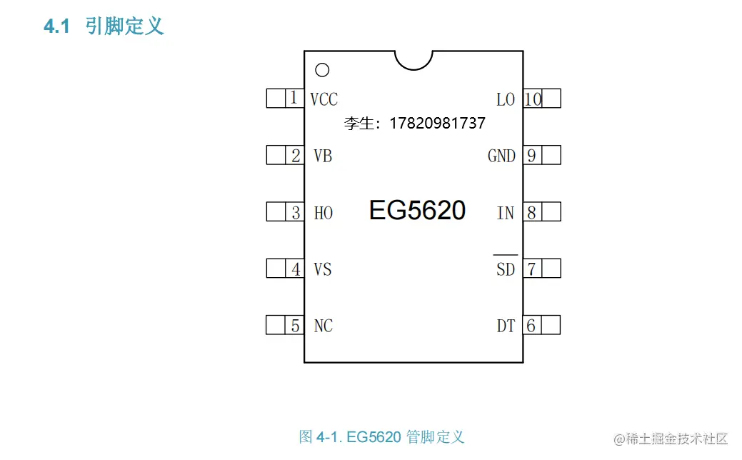 EG5620 的工作电压可达 100V,低端 VCC 的电源电压范围宽 5V~20V。该芯片输入通道 IN 内建 了一个 200K 下拉电阻,SD����内建了一个 200K 下拉电阻,在输入悬空时使上、下功率 MOS 管处于关闭状态, 输出电流能力 IO+/- 1.6/2.5A,采用 MSOP10 封装。