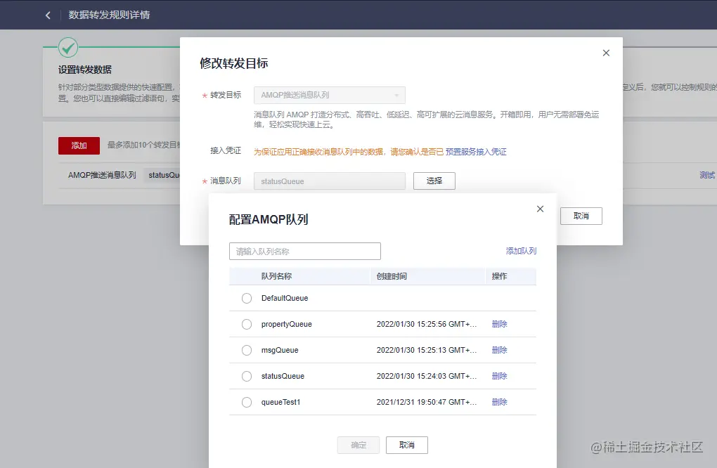 # mysql数据库配置,需要提前部署和创建distschedule的数据库# 数据库地址spring.datasource.url=datasource_url:jdbc:mysql://*****:3306/distschedule?useUnicode=true&characterEncoding=utf-8&useSSL=false&allowMultiQueries=true&serverTimezone=Asia/Shanghai # 数据库账号spring.datasource.username=*****# 数据库密码spring.datasource.password=****# 华为IOT云配置,参考上面的介绍,申请IOT云的AK,SK,APPIDcloud.iot.ak=*****cloud.iot.sk=*****cloud.iot.appId=*****# IOT云配置,参考上面的介绍,配置并获取华为IOT云的数据转发队列cloud.iot.amqp.accessKey= #接入凭证,添加转发目标时,点击接入凭证获取cloud.iot.amqp.password= #接入凭证密码,添加转发目标时,点击接入凭证获取cloud.iot.amqp.queueStatusName= #设备状态队列名称(不是规则名称)cloud.iot.amqp.queuePropertyName= #设备属性队列名称(不是规则名称)cloud.iot.amqp.queueMsgName= #设备消息队列名称(不是规则名称)cloud.iot.amqp.connectionUrl=amqps://*****.iot-amqps.cn-north-4.myhuaweicloud.com:5671?amqp.vhost=default&amqp.idleTimeout=8000&amqp.saslMechanisms=PLAIN #AMQP连接地址,点击“总览--》平台接入地址”获取# rabbitmq消息队列,用于手机监听告警信息spring.rabbitmq.host=***** # rabbitmq地址spring.rabbitmq.port=***** # rabbitmq端口spring.rabbitmq.username=***** # rabbitmq用户名spring.rabbitmq.password=***** # rabbitmq密码spring.rabbitmq.exchange.deviceproperty=deviceproperty_exchange # 消息exchange,可不改。如修改的话,FA侧也需要修改