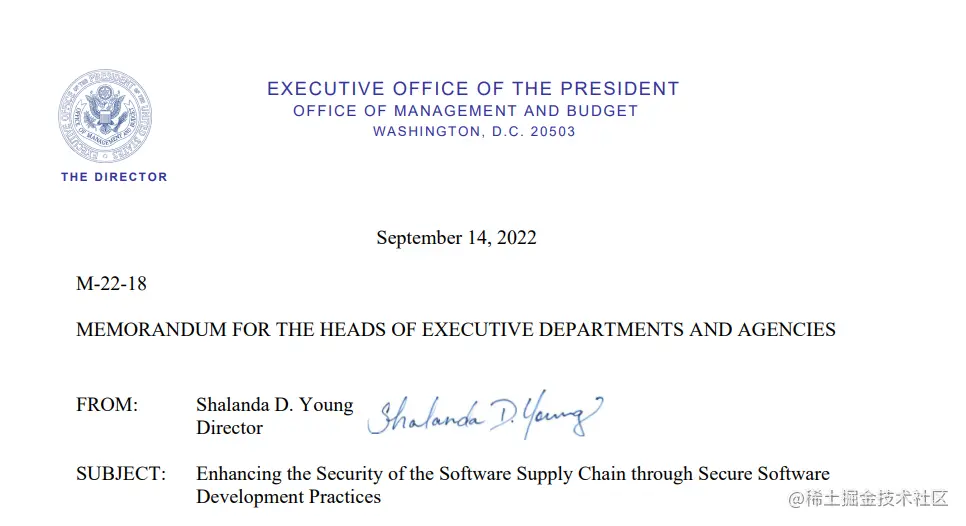 美国白宫在9月14日发布了题为《通过安全的软件开发实践增强软件供应链的安全性》的备忘录。该备忘录要求供应商产品需提供安全自我证明。自我证明是指开发人员必须提供以证明其符合安全软件开发框架的文档。
