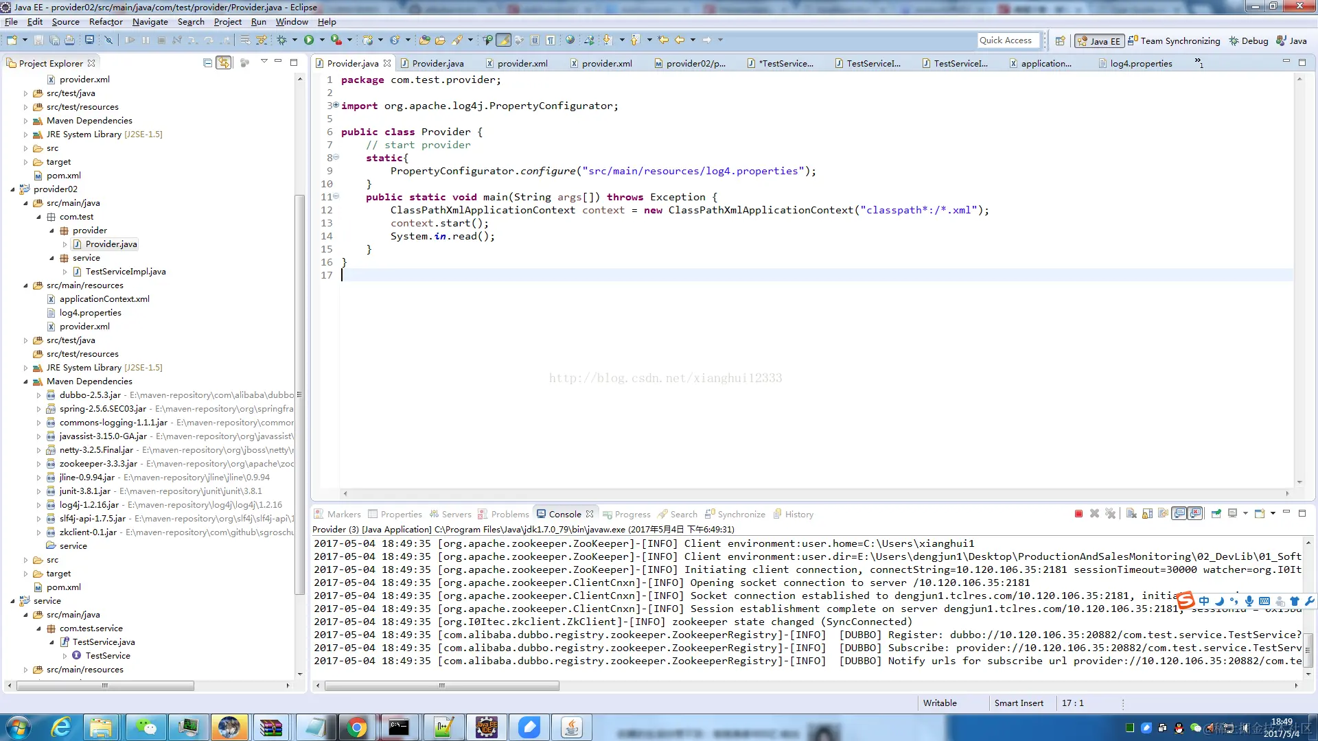 3.4 到这里提供者代码层面基本完了,该项目增加配置文件,在classpath目录下新建3个配置文件:applicationContext.xml(Spring配置文件),log4.properties,provider.xml( dubbo 提供者配置文件,重要 )