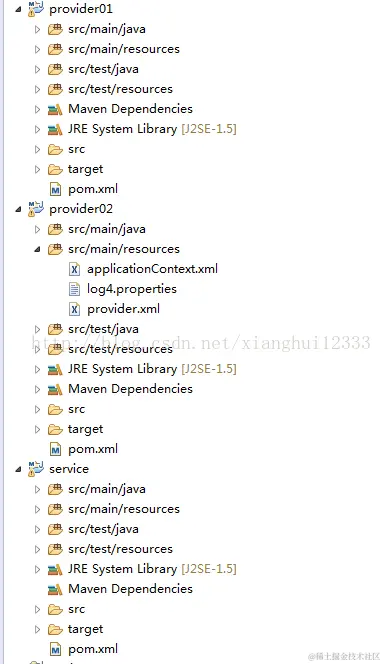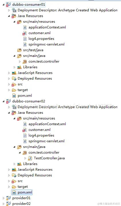 2个消费者(dubbo-consumer01,dubbo-consumer02)也一样,基本一样,就是服务实现不一样来测试负载均衡,还有个消费者配置文件不一样。