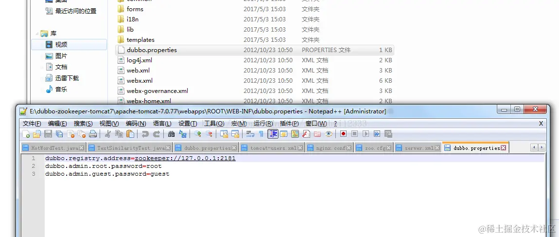 2.4 删除 tomcat webapp 目录下面的文件,将dubbo admin 包解压内容放到root目录中,修改classpath 目录下的dubbo.properties, 将这个监测中心注册到zookeeper,即将dubbo.registry.address改成你安装zookeeper的机子IP+zookeeper配置的端口。我这里是一台机子演示,默认端口与zookeeper是一致的所以不用修改。用户名密码就没有改动的必要了。
