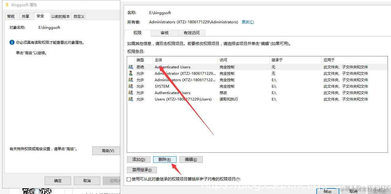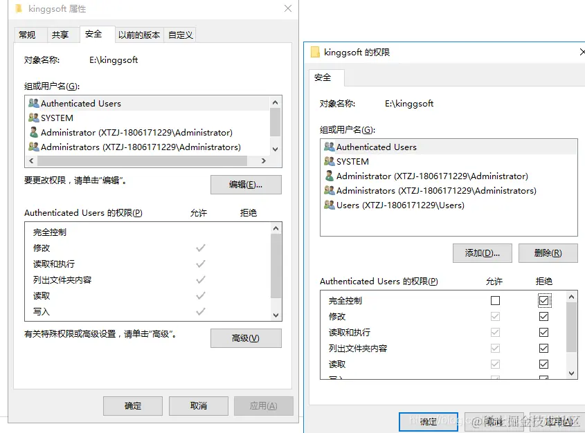 文件夹权限禁用和解除禁用 llad 2022-09-23 175 阅读1分钟 1.文件夹权限禁用: 右键文件夹——属性——安全——选择对应的用户——编辑——拒绝一栏打钩——确定 然后你会发现,文件夹对应的权限没有了,无法打开文件夹,无法重命名等 1.文件夹权限解除禁用: 文件夹右键——属性——安全——高级——继续——删除禁用的用户