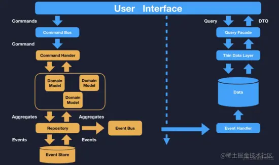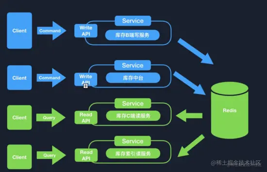 上面我们也提到了,进行了整体功能的拆分,并没有对具体的读写服务的拆分。在面向服务的场景下,功能里也是分读服务、写服务。那么我们有什么原则来指导读写服务的分离么?那就是 CQRS 的思想:命令职责查询分离,不单单指代码,同样也是适用于服务。