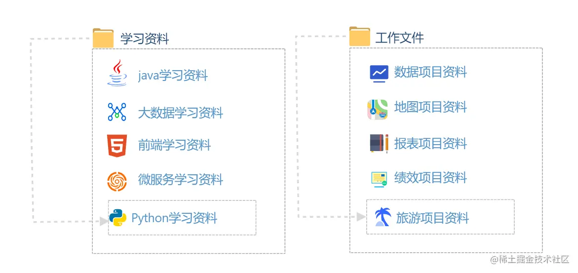 在我们系统盘里存放着大量的文件,通过文件夹去区分不同的类型,比如我现在有个“学习资料”和“工作文件”的文件夹,我们需要去访问文件夹去查找文件。