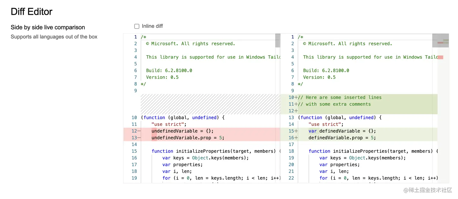 Monaco Editor的能力非常丰富,此处不能列全,仅用几个距离,感兴趣的同学可以在官网的playground中查询。