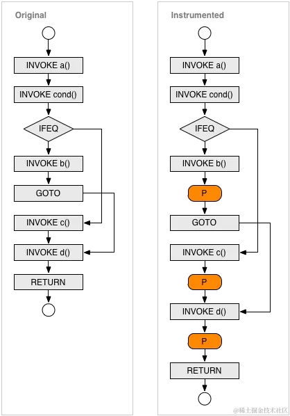 当我们要统计代码覆盖率的时候,就需要在代码的执行路径上加入探针分析。通常是在读取类的时候,在关键的指令块的出口与入口增加标记。当指令块被执行后,就会命中探针并完成记录。