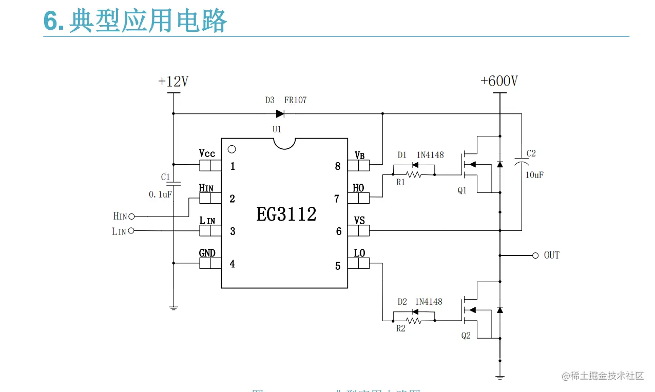 EG3112 的工作电压可达 600V,低端 Vcc 的电源电压范围宽 2.8V~20V,静态功耗小于 5uA。该芯 片具有闭锁功能防止输出功率管同时导通,输入通道 HIN 和 LIN 内建了一个 200K 下拉电阻,在输入悬空时 使上、下功率 MOS 管处于关闭状态,输出电流能力 IO+/- 2/2.5A,采用 SOP8 封装。
