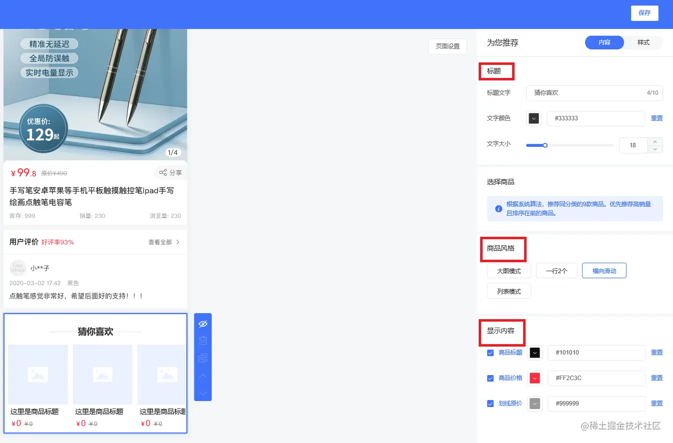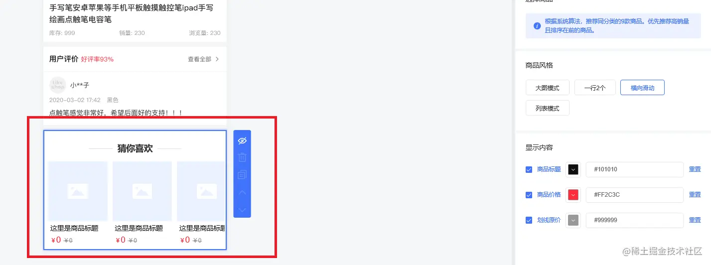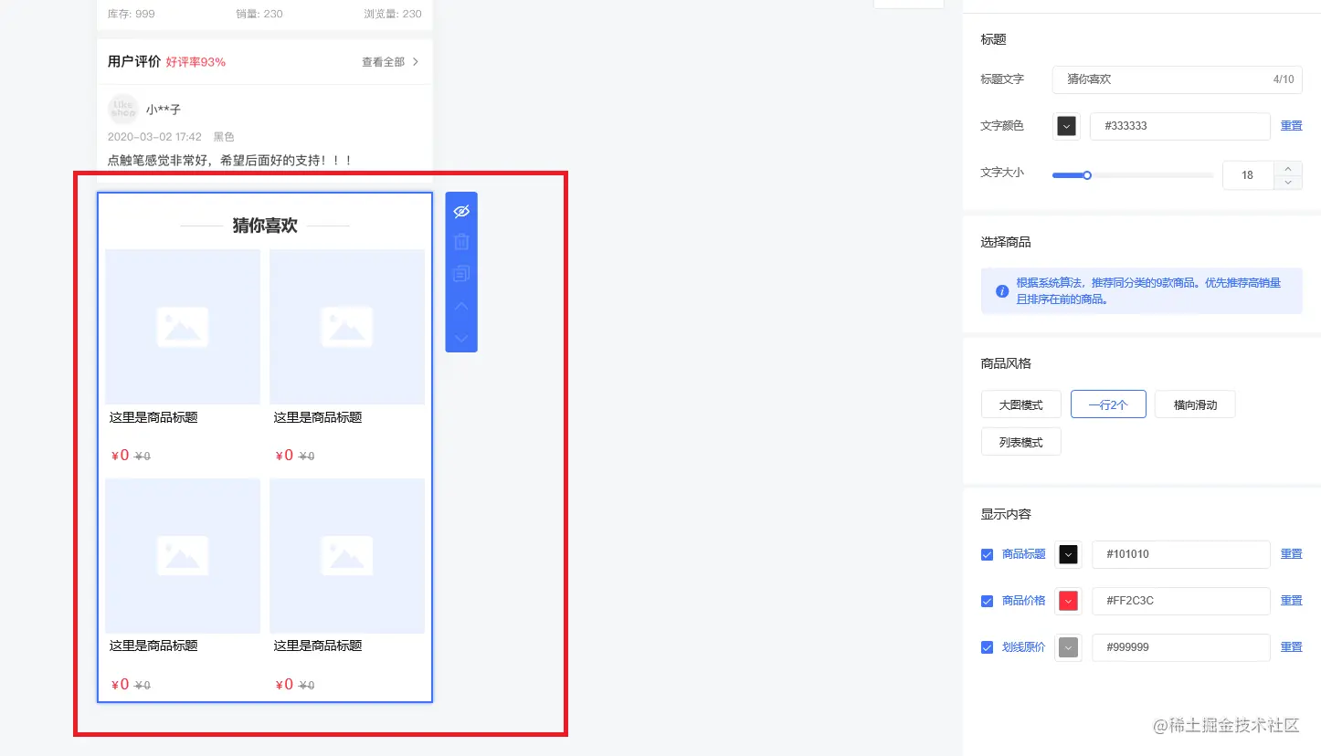 推荐组件:根据系统算法,推荐同分类的9款商品,优先推荐高销量且排序在前面的商品。可以分别设置内容与样式。