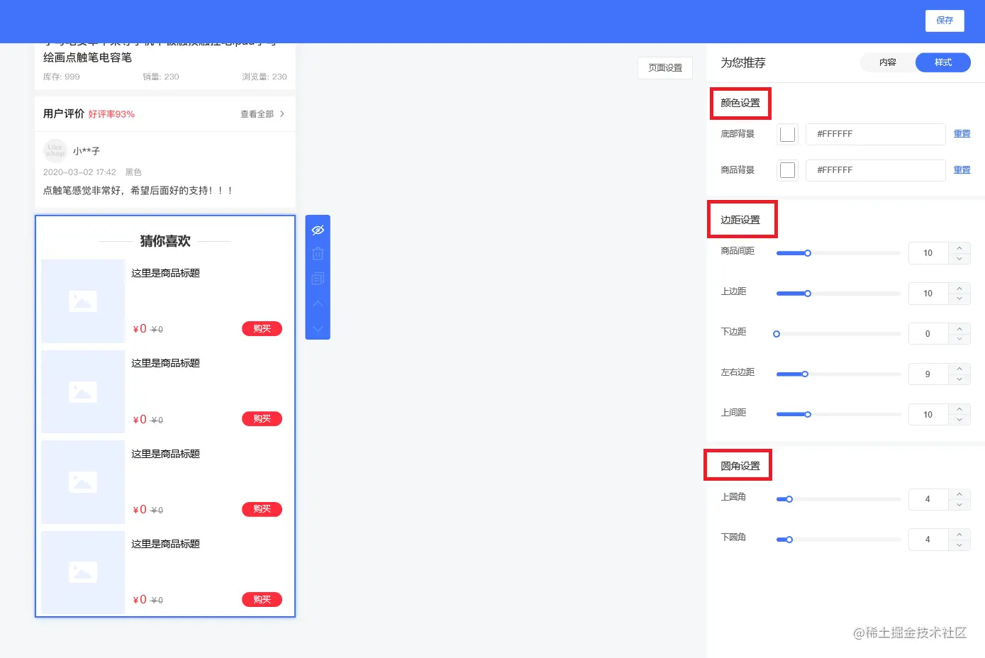 样式设置有颜色设置、边距设置、圆角设置等,如下图所示: