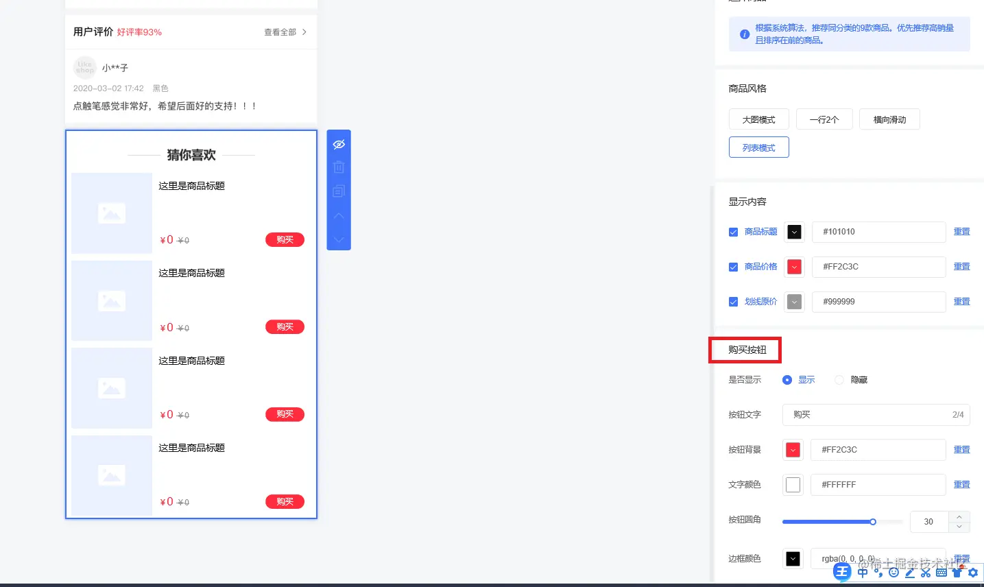内容可以设置标题、商品风格、显示内容、购买按钮等,如下图所示: