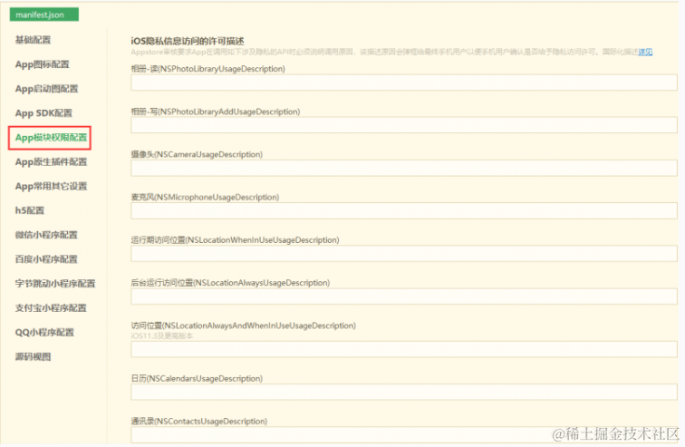 开发者可复制以下代码到manifest.json文件中并根据实际使用情况进行增减