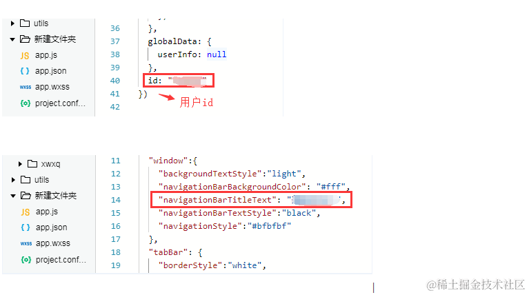 2.在app.js中修改id(客户登录后台管理系统的id),app.json中修改页面导航栏标题navigationBarTitleText