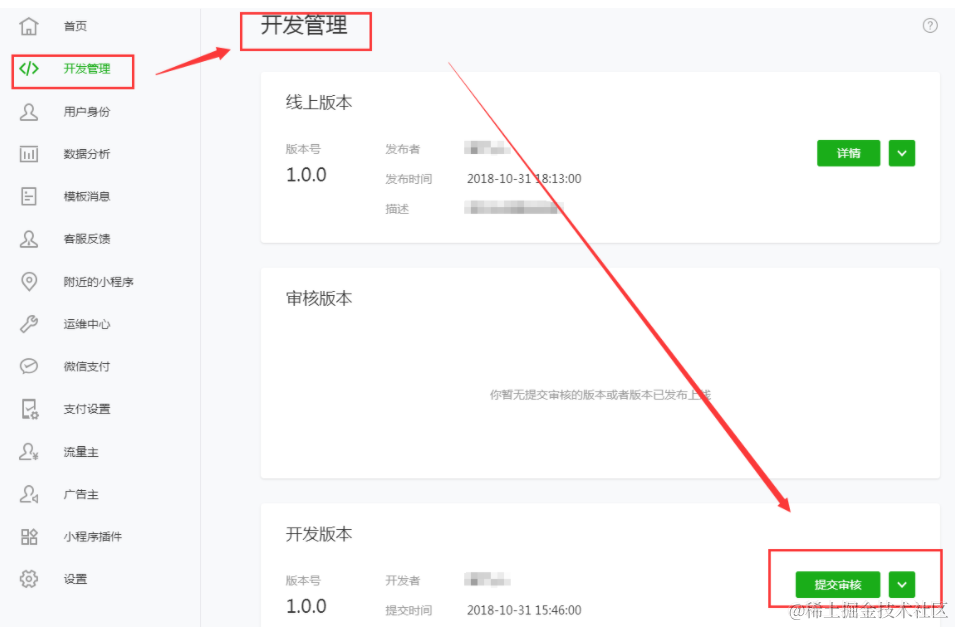 7.上传成功后,去到微信公众平台 -> 登录(客户的账号密码) -> 开发管理 ->提交审核
