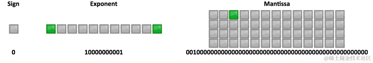 注意以上的公式遵循科学计数法的规范,在十进制是为0<M<10,到二进行就是0<M<2。也就是说整数部分只能是1,所以可以被舍去,只保留后面的小数部分。如 4.5 转换成二进制就是 100.1,科学计数法表示是 1.001*2^2,舍去1后 M = 001。E是一个无符号整数,因为长度是11位,取值范围是 0~2047。但是科学计数法中的指数是可以为负数的,所以再减去一个中间数 1023,[0,1022]表示为负,[1024,2047] 表示为正。如4.5 的指数E = 1025,尾数M为 001。