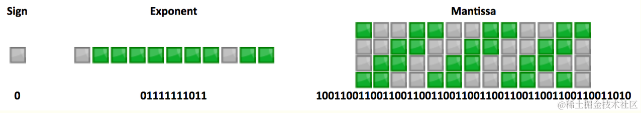 首先要搞清楚 JavaScript 如何存储小数。和其它语言如 Java 和 Python 不同,JavaScript 中所有数字包括整数和小数都只有一种类型 — Number。它的实现遵循 IEEE 754 标准,使用 64 位固定长度来表示,也就是标准的 double 双精度浮点数(相关的还有float 32位单精度)。计算机组成原理中有过详细介绍,如果你不记得也没关系。