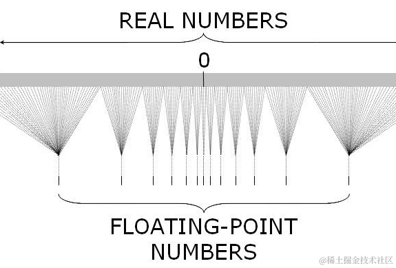 下面这张图能很好的表示 JavaScript 中浮点数和实数(Real Number)之间的对应关系。我们常用的 (-2^53, 2^53) 只是最中间非常小的一部分,越往两边越稀疏越不精确。