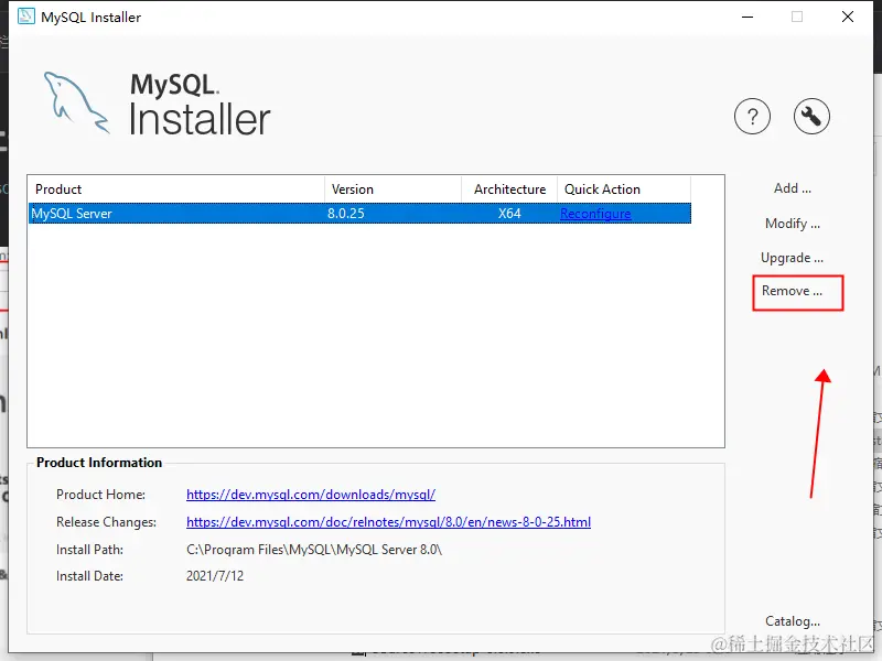 因为我mysql5.6是用官网msi来安装的,卸载我只需要打开msi文件,选择下方Remove,一直下一步就可以了(这里图片展示的数据库是安装好的5.8)
