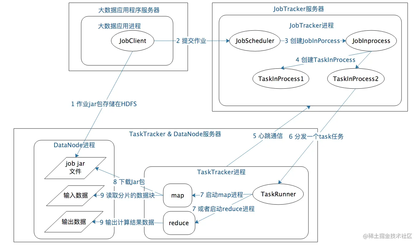 **2.JobTracker进程:**根据输入数据数量,命令TaskTracker进程启动相应数量的Map和Reduce进程,并管理整个生命周期的任务调度和监控。