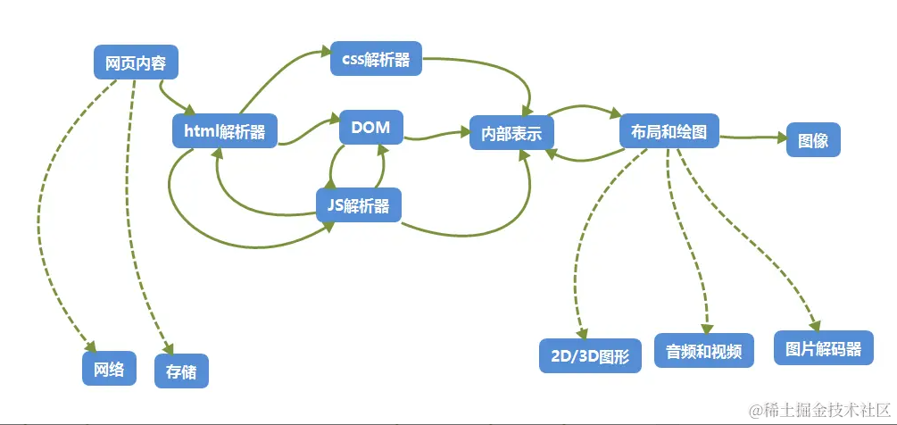 在这个过程中,html中可能会通过link去引入其他相应的资源,比如css的资源,这个时候浏览器可能就会兵法的向服务器去请求这个相关的静态资源,请求回来后通过css解析器对其进行解析,从而生成一个css树,去和dom树进行结合生成一个render Tree,进一步的进行一个布局,最终进行绘制。