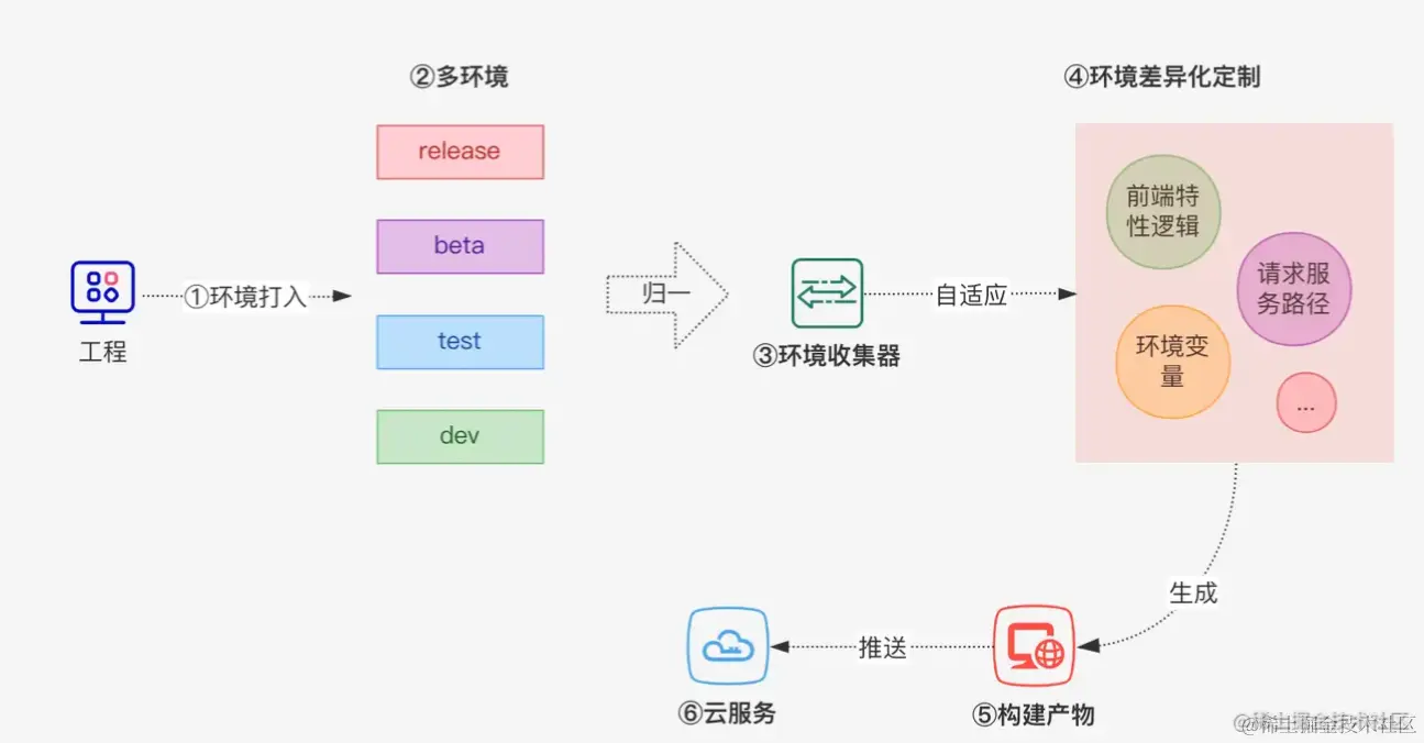 构建和发布:之后就是项目根据以上几步产出的环境特性文件来打包,最终推送到服务端完成整个前端工程的生产。