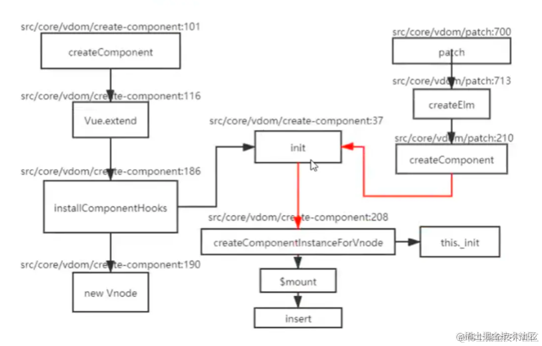 产生组件虚拟节点 -> 创建组件的真实节点 -> 插入到页面