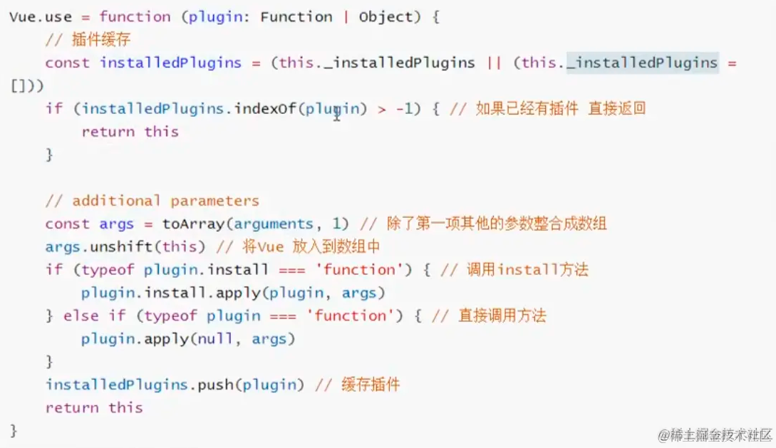 Vue.use是用来使用插件的。我们可以在插件中扩展全局组件、指令、原型方法等。 会调用install方法将Vue的构建函数默认传入,在插件中可以使用vue,无需依赖vue库